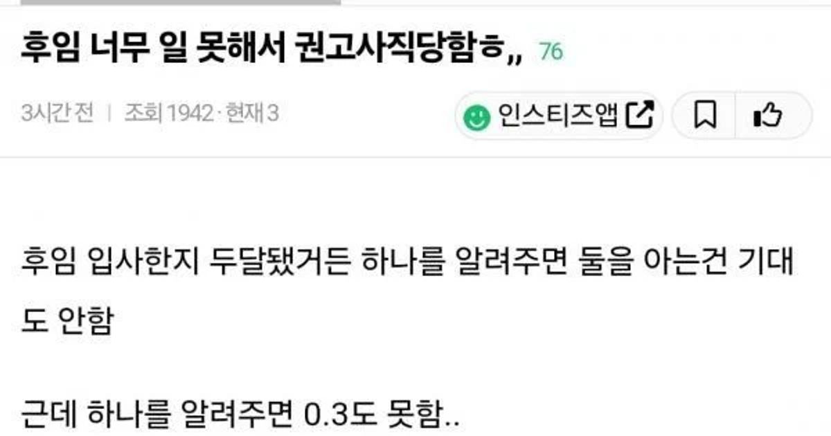 후임 너무 일 못해서 권고사직 당함